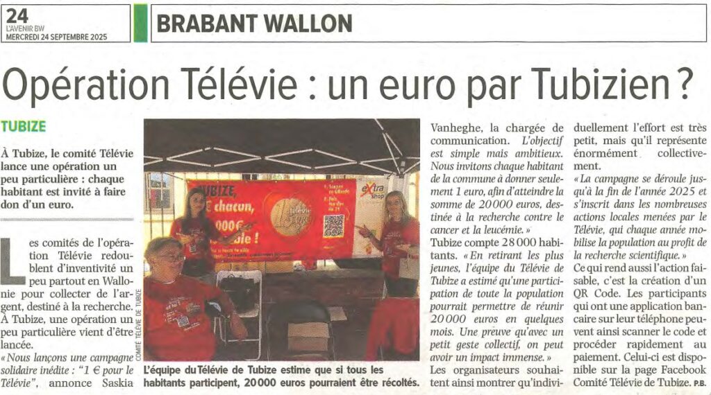 Sa réponse ne tarda pas à arriver : « oui car le Télévie représente pour moi l’espoir et une façon d’aider les autres ce qui me porte à cœur ».Les prestations en notre compagnie ne tardèrent pas sur Tubize.